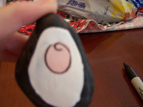 Once dry, dab your fingertip into peachy paint and make a small oval about 1/3 of the way from the top of the rock...this is your face. Let dry.